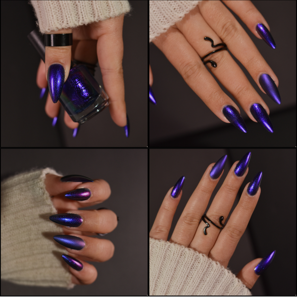 Blue-based purple-red-blue-copper multichrome with blue shimmer.