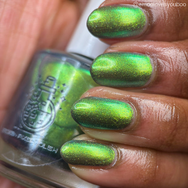 Christmas Pickle has a blue base with a green-gold sparkling metallic shifting shimmer. A strong green color is more visible outdoors. Inside, the gold is more visible. Blue base is visible at extreme angles.