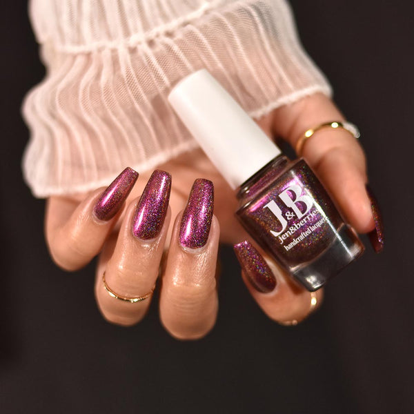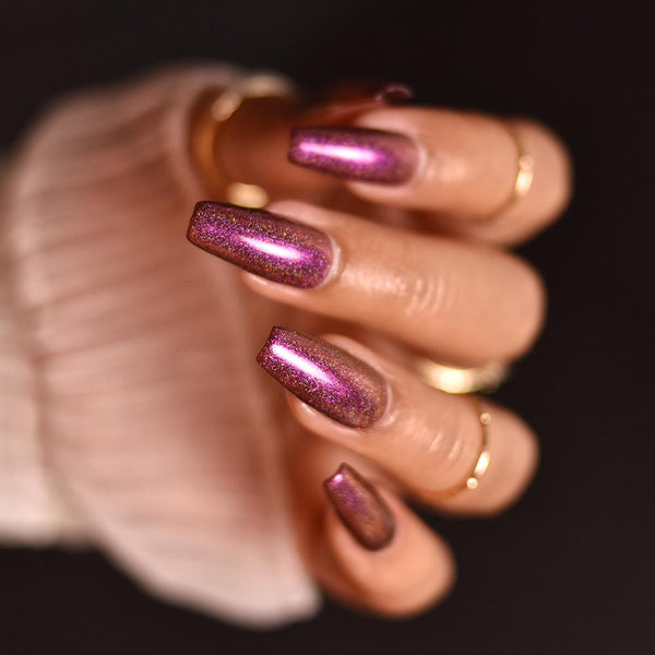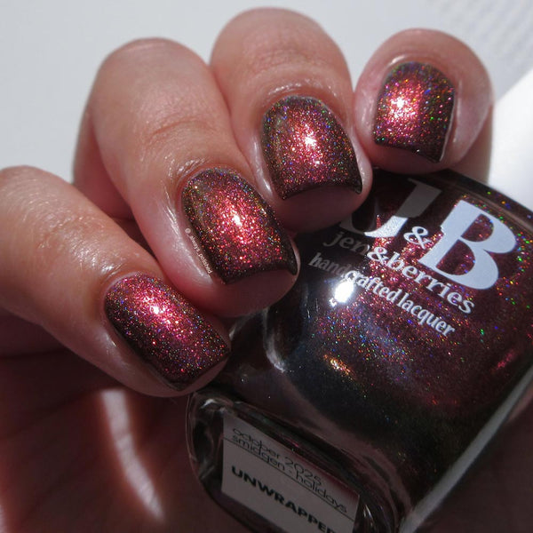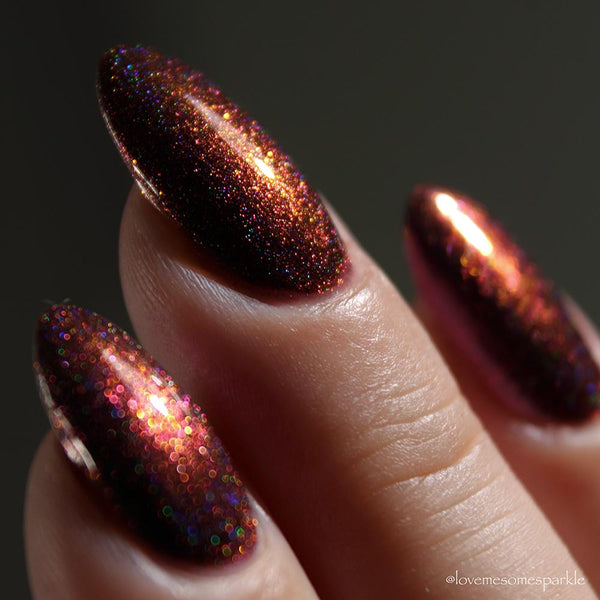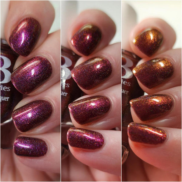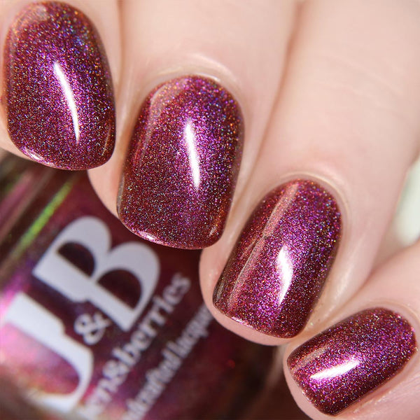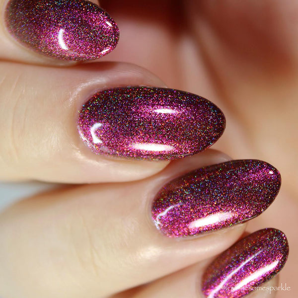 Burgundy linear holographic base with purple/pink/gold/green (at extremes) shifting multichrome shimmer, scattered red flecks and scattered holographic flakes