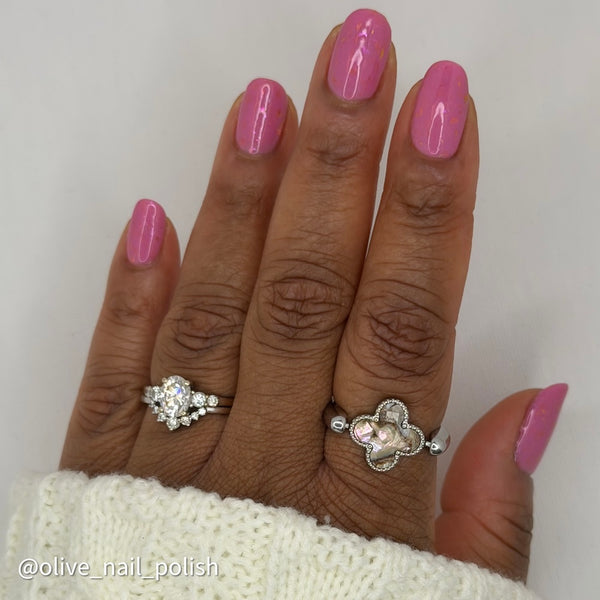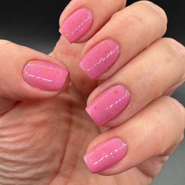 Danger in the Petals is a bubblegum pink jelly nail polish with magenta-to-gold shifting flakes and shimmer. This shade is inspired by the tiny Orchid Mantis, a beautiful yet dangerous predator that camouflages itself as a flower to lure in pollinating insects. Coverage in 2 coats.