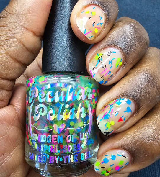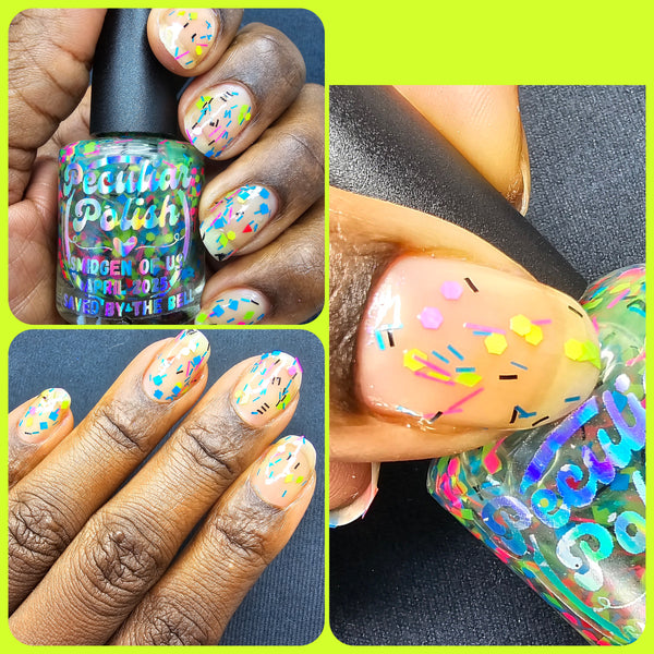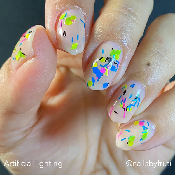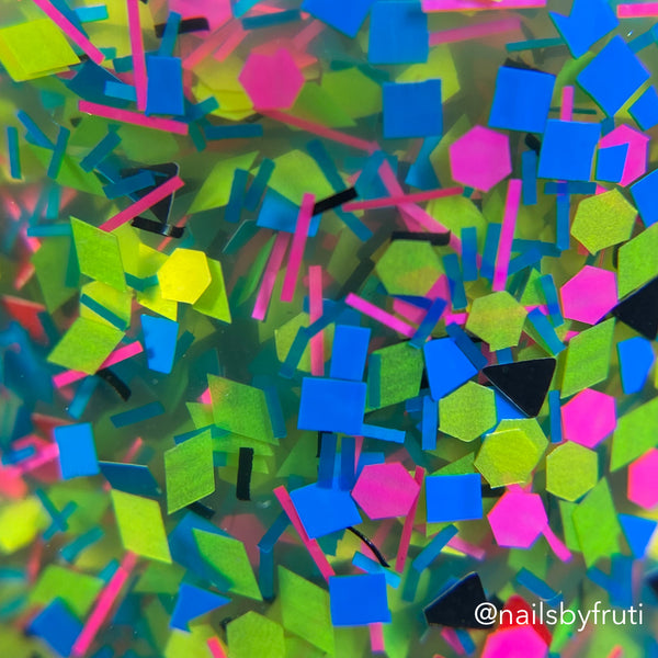 Glitter colors are : neon blue, pink, yellow, green, and orange. Glitter shapes are : squares, bars, triangles, and hex! This polish topper is so fun!