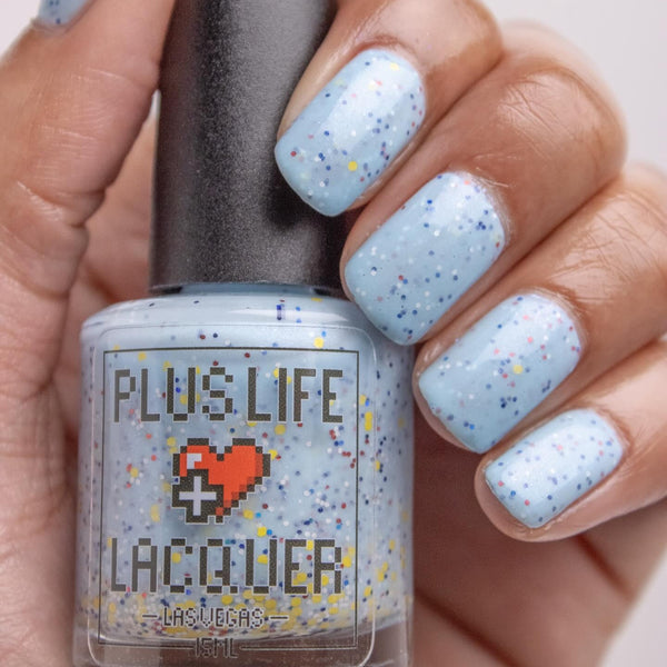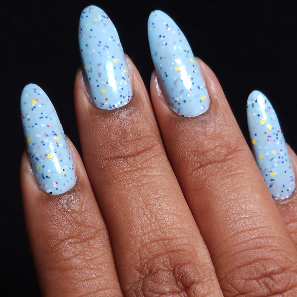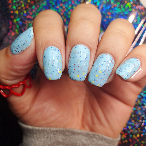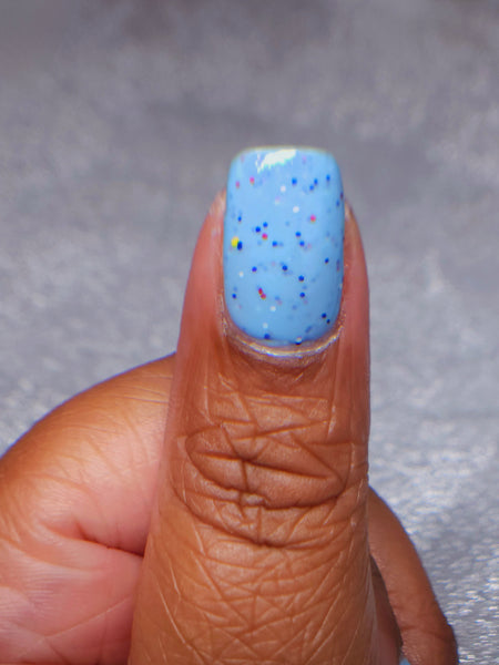 Description - A soft blue crelly with a blue shimmer, white and yellow matte glitter, red metallic glitter, and blue holo glitter.