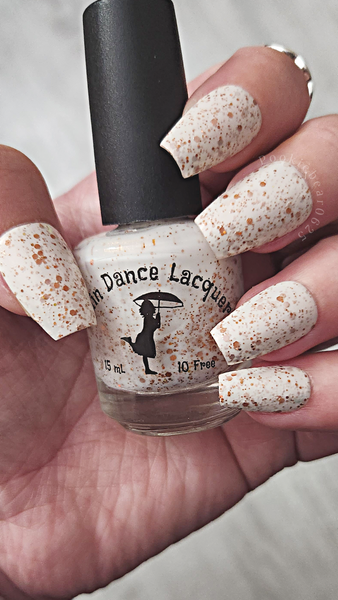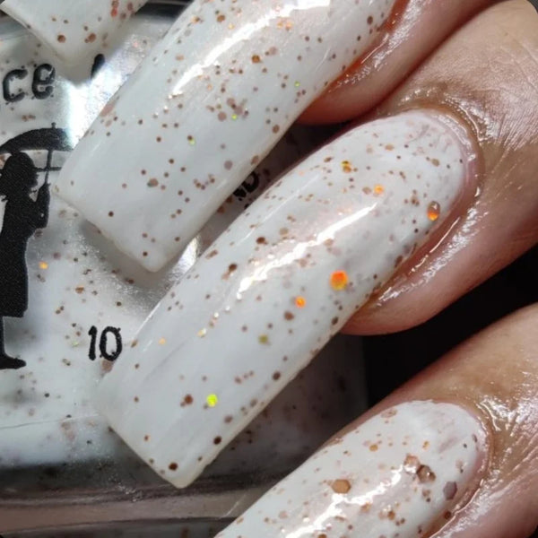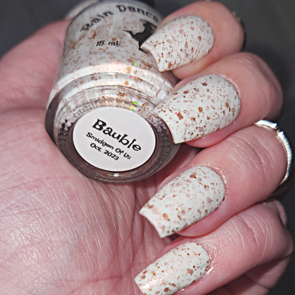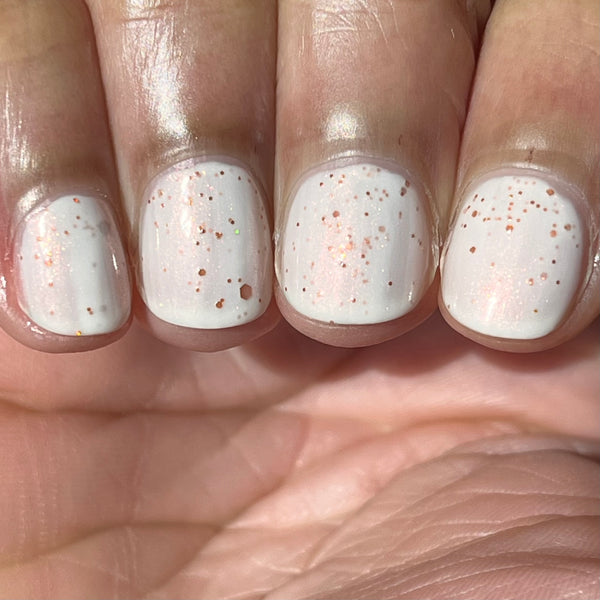 Description - Baubles is a white crelly base with copper pearl shimmer and a mix of copper holographic glitters. 10 free, vegan and cruelty free. Swatches by @black.lady.nails, @littlepandapit, @sassynaildesigns and @pookiebear0625 on IG.