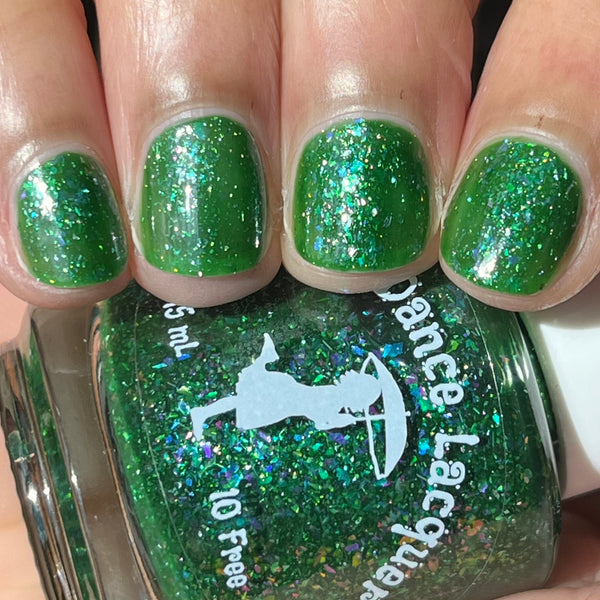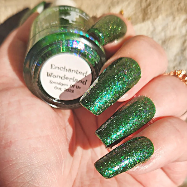 Description - Enchanted Wonderland is a beautiful forest green jelly base that's packed with iridescent flakes shifting through fuchsia, green, gold and blue and finished with a scattering of silver holographic micro flakes. 10 free, vegan and cruelty free. Swatches by @black.lady.nails, @littlepandapit, @sassynaildesigns and @pookiebear0625 on IG.