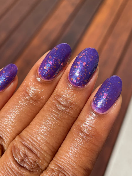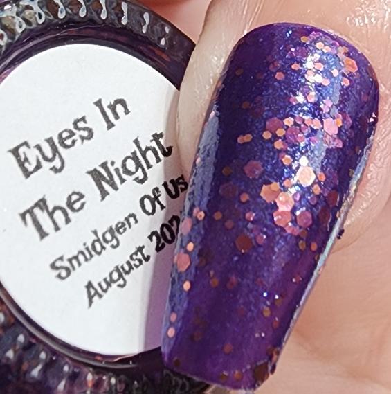 Description - Eyes In The Night is a purple jelly polish with blue to purple micro flakes and multiple sizes of copper glitters. 10 free, vegan and cruelty free.