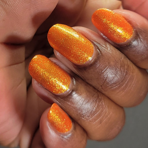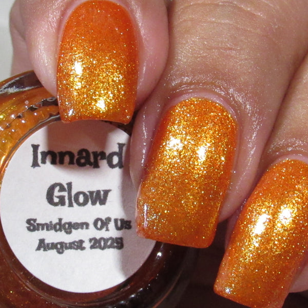 Innard Glow is a bright orange polish with a gold to green shimmer and gold reflective glitter. 10 free, vegan and cruelty free.