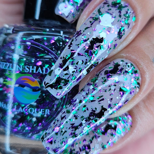 A topper with purple, and green shreds, white glitter, with bat and ghost glitter as well.