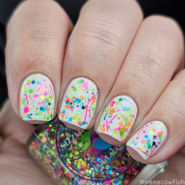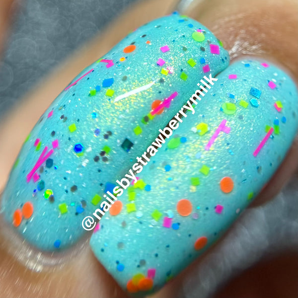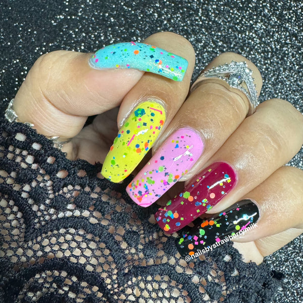 Description - A topper with neon pink slices, different sized holo, and various neon glitter in different shapes and sizes.