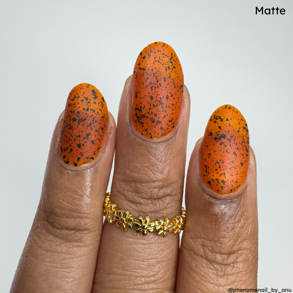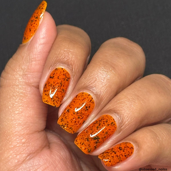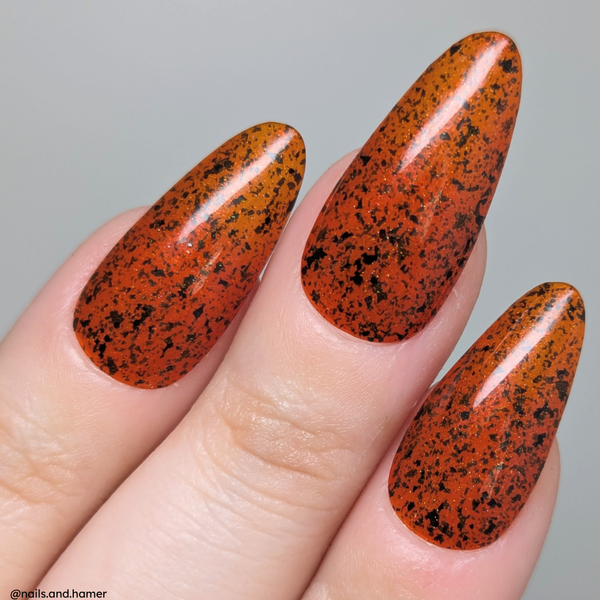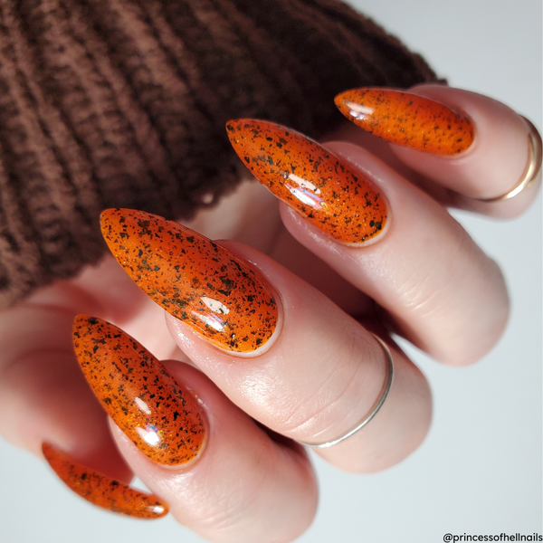Man-Faced Stink Bug, Judging is a burnt orange crelly with small metallic black flakes, holographic micro glitter and a faint orange shimmer. Base coat is recommended.