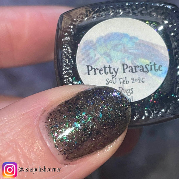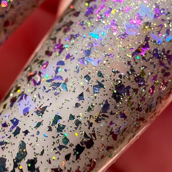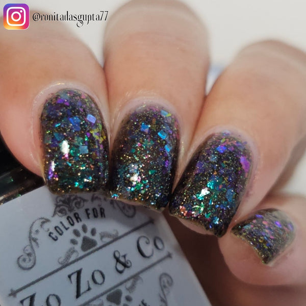 A smoky black jelly base filled with chrome chameleon flakes that shift gold, green, and blue, with flashes of purple visible only at extreme angles. Subtle at rest, complex in motion, and intentionally deceptive.